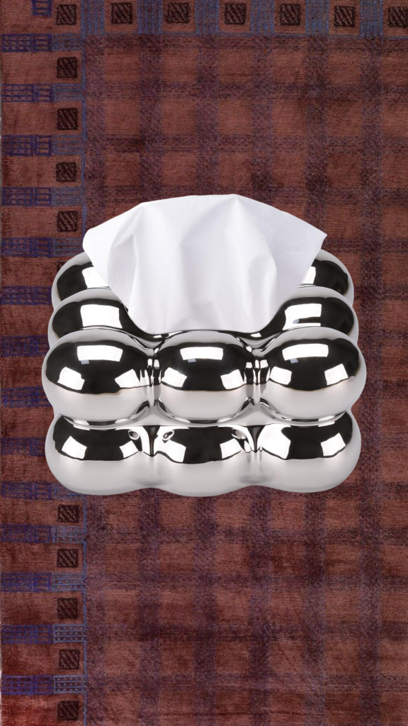 Shiny silver tissue box cover that catches the light just right.